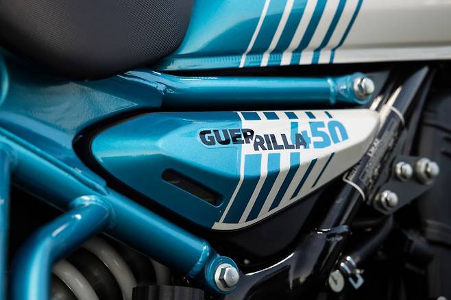 게릴라 450은 강렬한 이름에 걸맞게 로얄엔필드 역사에서 가장 공격적인 성향을 가진 로드스터 모델이다. 클래식 브랜드로만 여겨지던 로얄엔필드가 히말라얀 시리즈와 헌터350, 샷건650을 통해 기존의 이미지를 조금씩 탈피했하고 있으며 게릴라는 그 정점을 찍는 모델이다. 하지만 게릴라 450을 이야기하기 위해서는 앞서 선보인 히말라얀 450 이야기를 빼놓을 수 없다. 두 모델은 엔진을 공유하는 형제 모델이기 때문이다. 하지만 아쉽게도 히말라얀 450이 아직 국내 출시 전이기에 빗대어 설명하기가 힘들다. 우선 두 바이크에 장착된 셰르파 450 엔진은 452cc배기량의 수랭 단기통 엔진이다. 셰르파라는 이름부터가 히말라야 산맥고산지대에 살며 히말라야 원정대를 돕는 티벳 민족을 지칭하는 말이다. 이름부터 히말라얀을 위해 태어난, 정체성이 확실한 엔진이다. 2020년 모토히말라야에 참가했을 때 당시에 히말라야 쏘카Tsokar 호수 인근에서 차량 테스트 중인 로얄엔필드 본사 직원들을 만났다. 그리고 운 좋게 당시 테스트 중인 모델도 직접 볼 수 있었다. 위장막에 가려있었고 내부 사양은 알 수 없었지만 외부에서 봐도 알 수 있었던 가장 중요한 정보는 엔진이 수랭 방식이라는 점과 휠 사이즈였다.