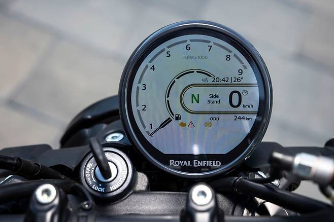 디자인의 완성도는 높은 점수를 줄 수 있다. 게릴라를 통해 로얄엔필드가 빠르게 발전하고 있음을 다시 확인할 수 있었다. 부품 하나하나의 완성도도 좋고 마감도 깔끔하다. 물론 자세히 살펴보면 곳곳에 살짝 거친 부분이 남아있다. 하지만 특정 부분의 퀄리티가 처지는 느낌도 없이 전체적으로 고르게 완성도가 높았다. 히말라얀 450과 엔진을 공유하고 있지만 차제 전반에는 전용 부품들이 많이 쓰이고 있다. 히말라얀 450과 메인 프레임 구조는 비슷하지만 서브프레임과 스윙암도, 볼륨감 있는 연료 탱크까지 모두 게릴라 전용이다. 연료 탱크는 근육질의 캐릭터라인이 엇갈리며 볼륨감이 상당히 좋다. 배색 역시 독특하다. 블랙과 옐로우의 강렬한 대비에 보색이 되는 보라색을 포인트 컬러로 사용한 ‘옐로우 리본’, 선명한 블루와 화이트 컬러가 조합된 ‘브라바 블루’, 금색과 레드 컬러가 아이언맨을 연상시키는 ‘골드 딥’ 등 다양한 컬러가 준비된다. 히말라얀 450에서 칭찬했던 TFT계기반은 그대로 적용되었다. 계기반 상단에 네비게이션의 라이브 맵을 화면 가득하게 띄울 수 있다. 아쉽게도 구글맵의 문제로 국내에서는 지원되지 않는다. 현장에 전시되었던 차량 중 베이직 라인업에 속하는 스모크 실버 컬러에는 아날로그 계기반이 장착되어 있었는데 계기반 사양은 국가별로 달라질 수 있다고 한다.