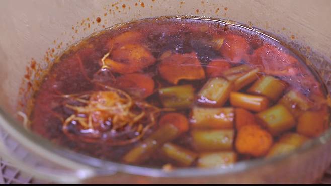 고추기름이 뜨겁질 않을 때, 고운 채에 잘 걸러 주시면 된답니다.