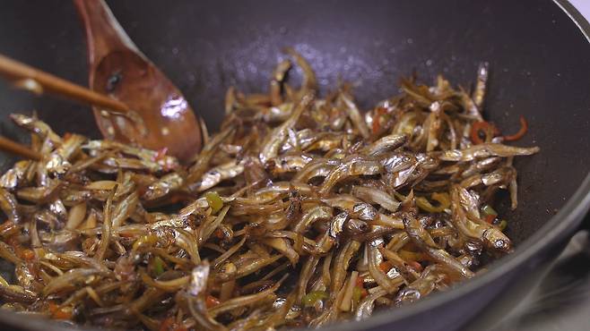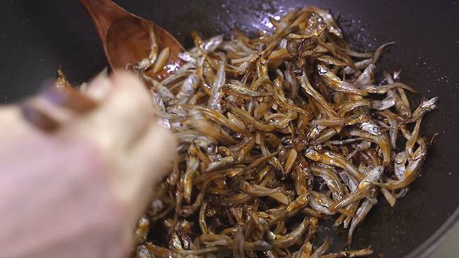 멸치에 간이 배었을 때, 불을 끄세요. 참기름, 깨를 넣고 섞으면 완성!