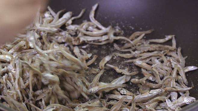 이제 멸치를 프라이팬 중불에서 1분 동안 볶아 주세요. 한번 볶으면 수분과 비린맛이 날아가 더욱 좋아요. 그리고 따로 빼서 식혀주세요.