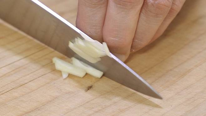 마늘 편 썰기, 고추 송송 썰기 하세요.