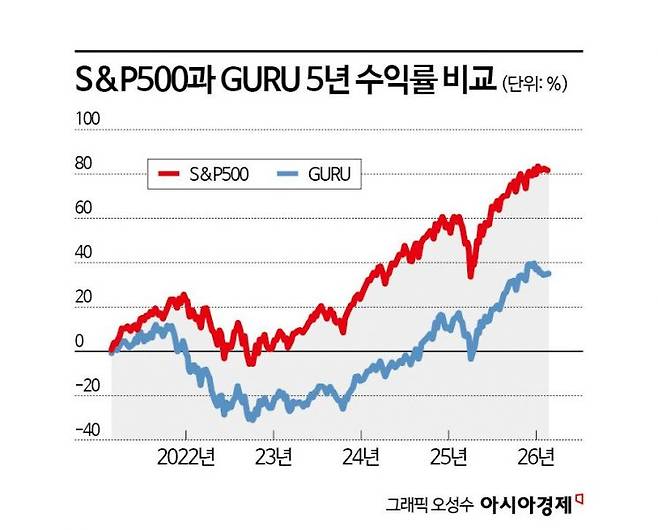 그렇다면 13F를 따라 샀을 때 성과는 어떨까. 완벽한 대리 지표는 아니지만 'Global X Guru ETF'의 수익률 지표는 참고가 될 수 있다. 미국 상장 대형 헤지펀드들의 SEC 13F 보고서를 기반으로, 그들의 상위 보유 종목을 추종하여 투자하는 상품이다. 이 ETF의 최근 5년 성과는 S&P500 지수를 하회한다. 단기적으로 격차가 줄어드는 구간이 있어도, 장기 초과 수익을 내기 어렵다는 것을 보여준다.