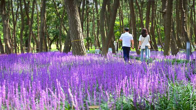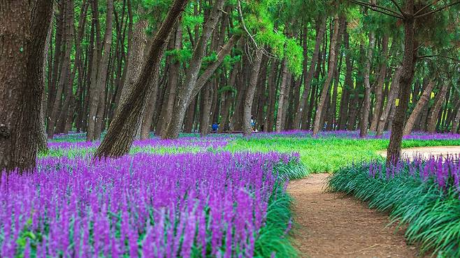 특히 8월이면 이 솔숲은 보랏빛 맥문동으로 물들어, 깊은 녹음 사이에서 또 다른 색의 향연이 펼쳐집니다. 약 600만 본에 이르는 맥문동이 만들어내는 장관은 여름의 끝자락에 오직 이곳에서만 만날 수 있는 특별한 풍경입니다.