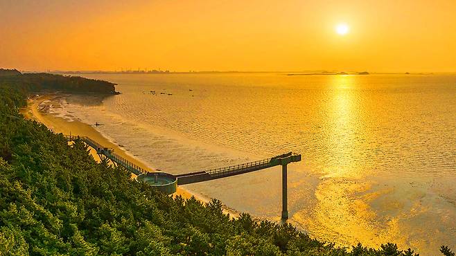 발 아래로는 울창한 소나무가, 눈앞으로는 탁 트인 서해 바다가 펼쳐지며, 길의 끝에는 붉게 물든 석양을 감상할 수 있는 전망 데크가 기다리고 있습니다.