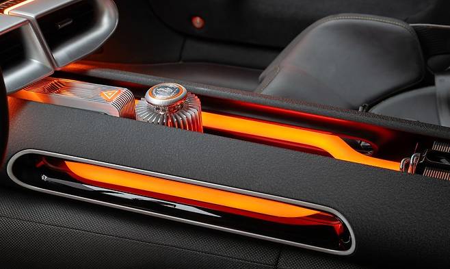 또한 실내에서 눈에 띄는 요소는 센터 콘솔이다. 발광하는 오렌지 색 파이프는 고전압 케이블을 연상시키며, AMG 문장의 형태를 띈 디자인 요소는 고급스러움을 강조한다.