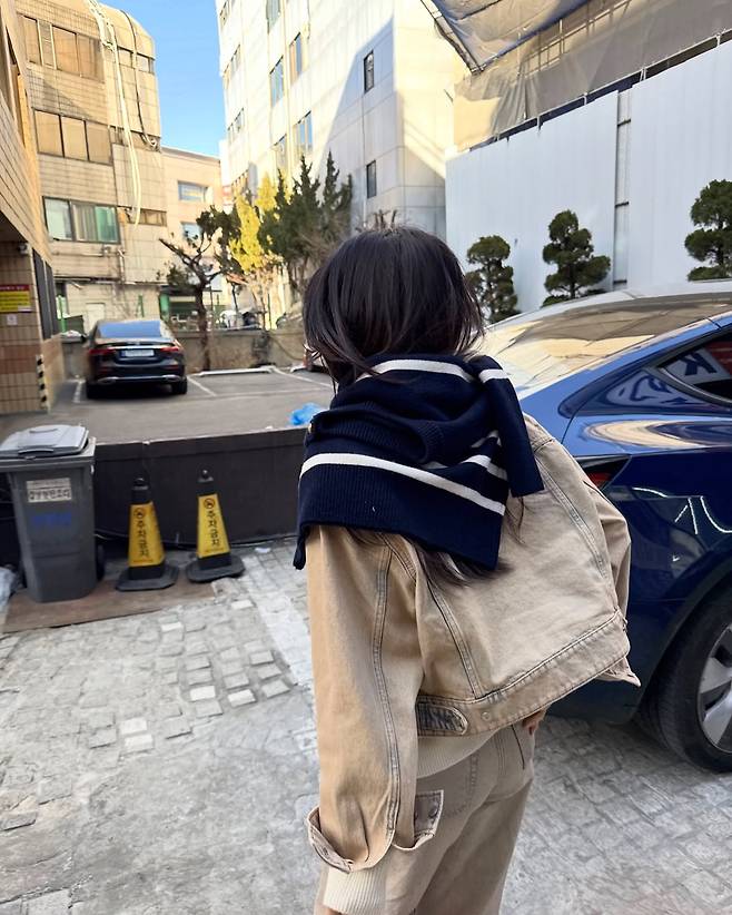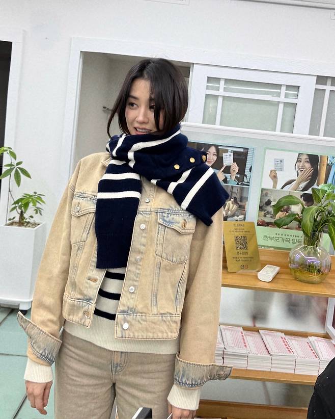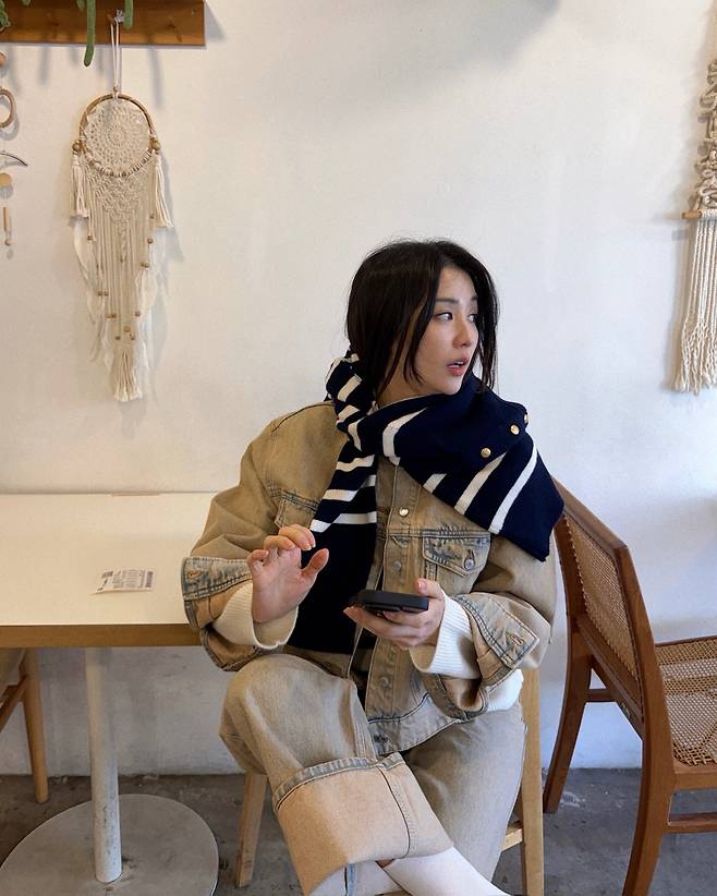 재킷 안에는 깨끗한 아이보리색 니트를 입고 그 위에 남색과 흰색이 섞인 줄무늬 목도리를 길게 늘어뜨려 시각적인 즐거움과 따뜻함을 동시에 잡았습니다.