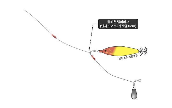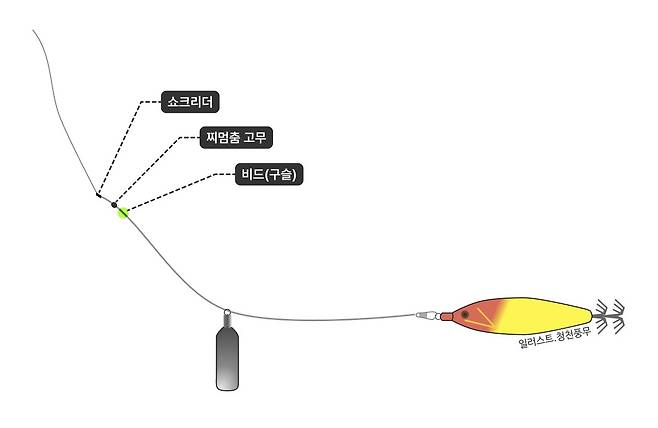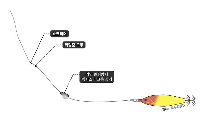 쇼크리더와 연결, 싱커, 에기를 전부 라인으로