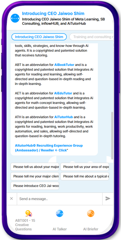 에스비컨설팅의 AI명함은 기본적인 명함 역할을 넘어, 탭-메뉴 기능을 통해 다양한 정보를 관리하고 소통할 수 있도록 설계되었습니다. 각 탭은 특정 주제에 맞는 지식 파일을 학습하며, 상대방의 질문이나 요청에 실시간으로 답변합니다.