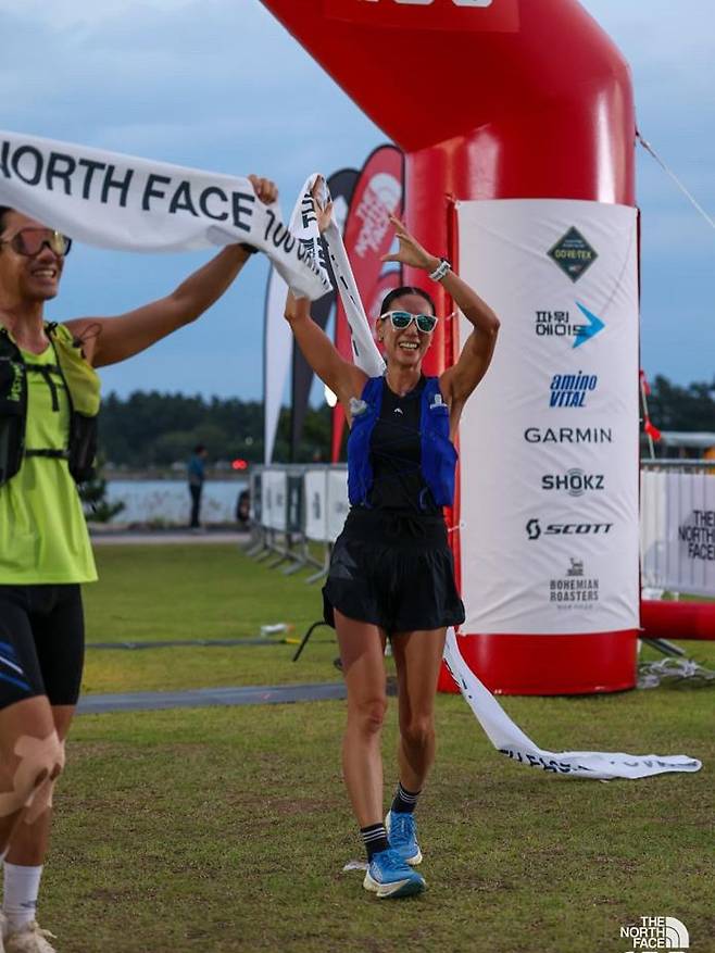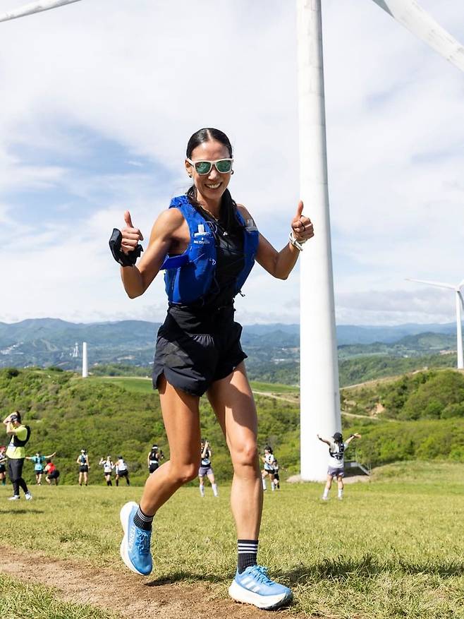 특히 이번 룩의 중심이 된 아이템은 ‘러닝 베스트’. 몸에 밀착되는 구조로 장거리 트레일에도 안정감을 주며, 수분 보충을 위한 물통 포켓과 경량 소재는 기능성과 활동성을 동시에 만족시킨다. 이와 함께 블랙 하이웨이스트 쇼츠는 다리 라인을 길어 보이게 해주는 효과를 주며, 블루 러닝화와 컬러를 맞춘 센스 있는 스타일링이 돋보인다. 디바 비키는 이너웨어 없이 민소매 베스트만을 착용해 근육 라인을 강조하며, 강인한 여성 이미지를 부각시켰다.
