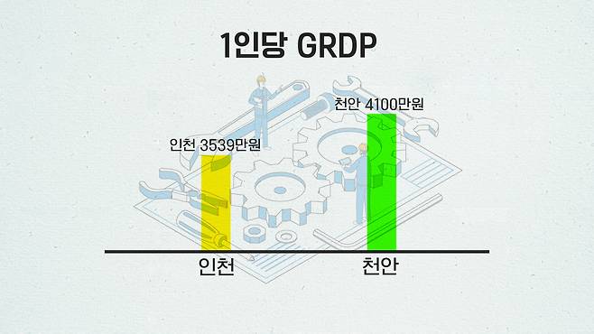 인구 체급이 높은 인천은 지역내총생산(GRDP), 즉 생산된 것의 총합에선 크게 앞선다. 그러나 ‘제조업 도시’ 천안이 1인당 GRDP는 한참 높다.천안 사람 1명이 생산하는 게 훨씬 많다는 얘기.