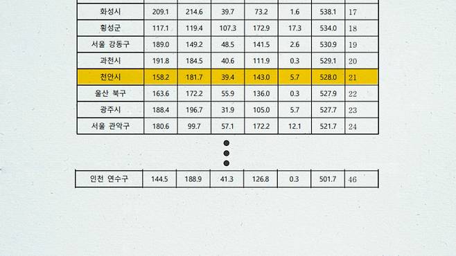 그럼 천안 사람들이 인천 사람보다 잘 사느냐, 그건 좀 섣부르다. 2022년 근로소득 연말정산을 보면, 천안은 1인당 3879만원, 인천은 3877만원으로 꼴랑 2만원 차이다.천안 사람 각자가 만드는 돈은 많을지 몰라도 버는 돈은 별 차이 없단 것.