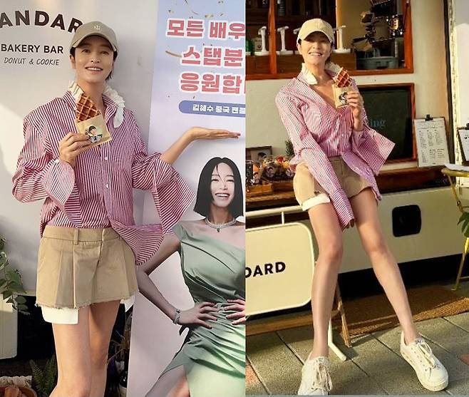 주름 디테일이 더해진 셔츠와 초미니 스커트의 조합은 50대라고는 믿기 어려운 동안 핏을 자랑했고, 와플을 든 채 활짝 웃는 모습은 마치 데뷔 초 청춘스타를 떠올리게 만들었습니다.