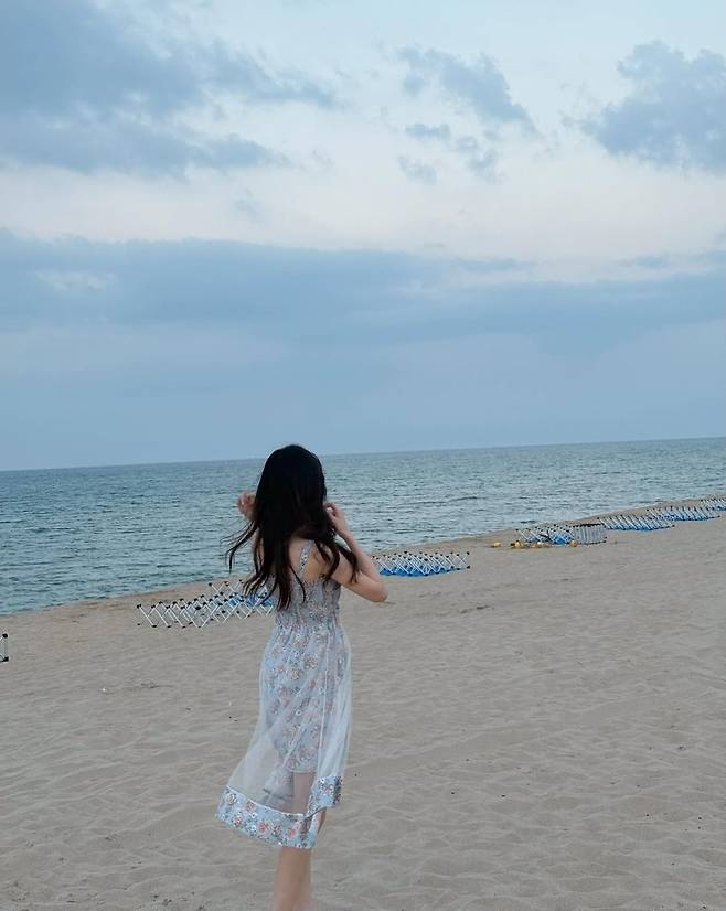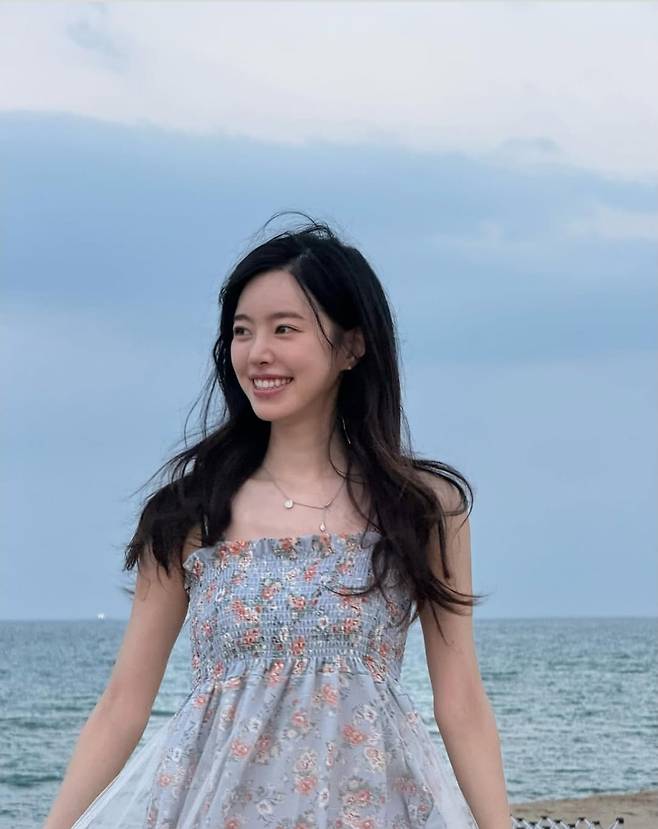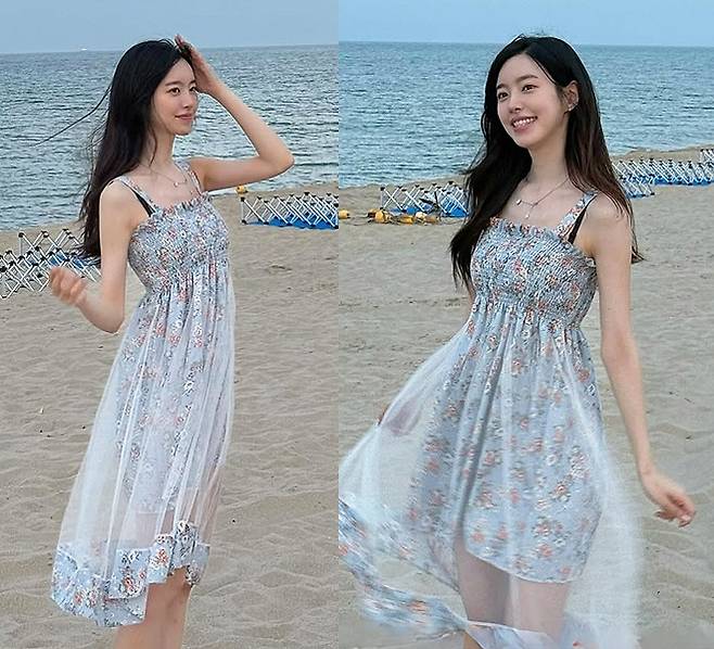 진세연은 바닷가를 배경으로 잔잔한 미소를 지으며 하늘빛 플라워 패턴의 원피스를 입고 등장했습니다.