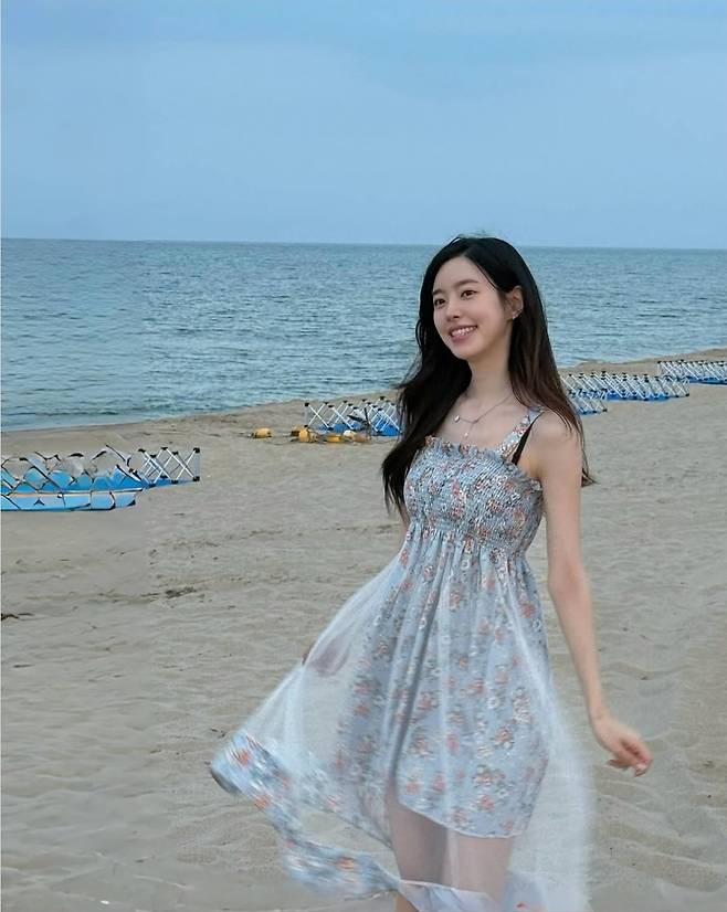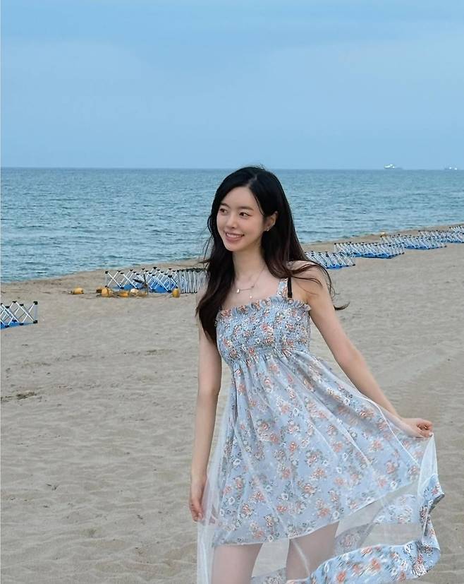 진세연은 바닷가를 배경으로 잔잔한 미소를 지으며 하늘빛 플라워 패턴의 원피스를 입고 등장했습니다.
