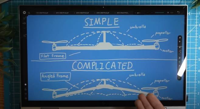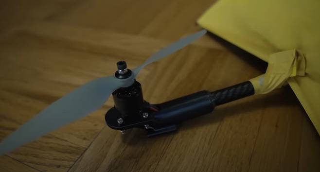 이 날아다니는 우산 밑에 숨은 드론 역시 그가 직접 제작한 것이다. 프레임의 튜브는 무게를 줄이기 위해 탄소 섬유로 제작했으며, 모터와 프로펠러를 장착한 튀어나온 부분은 3D 프린팅을 이용했다.