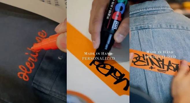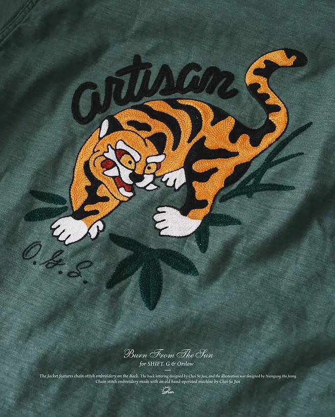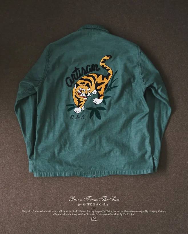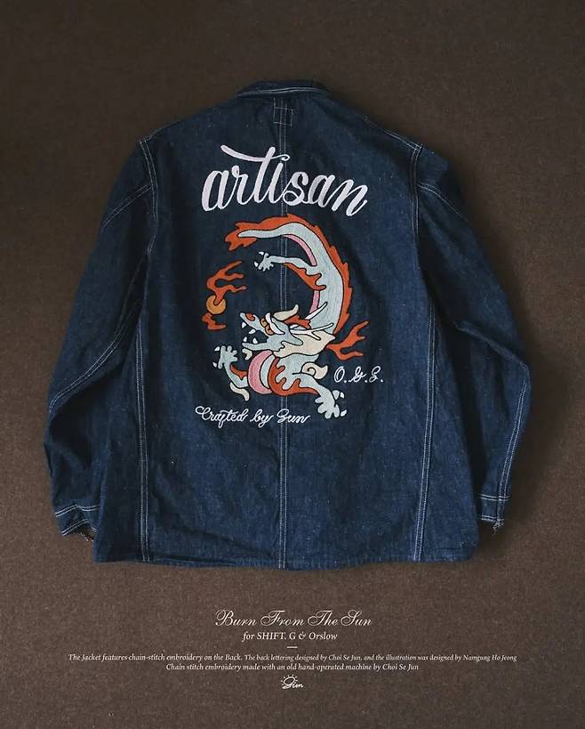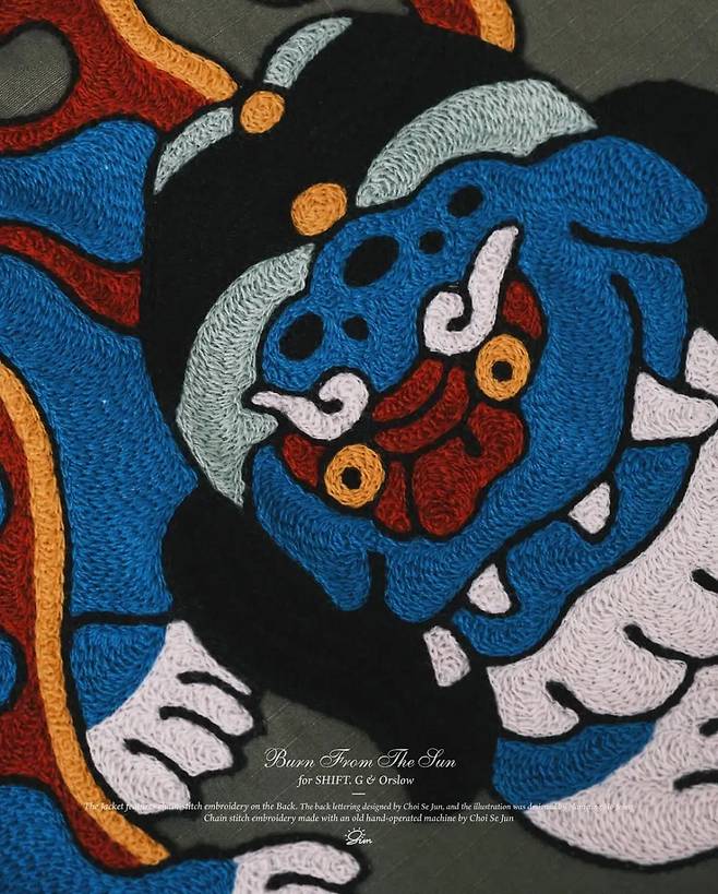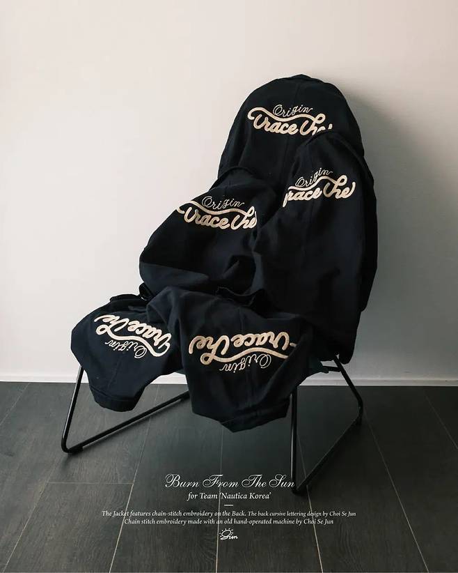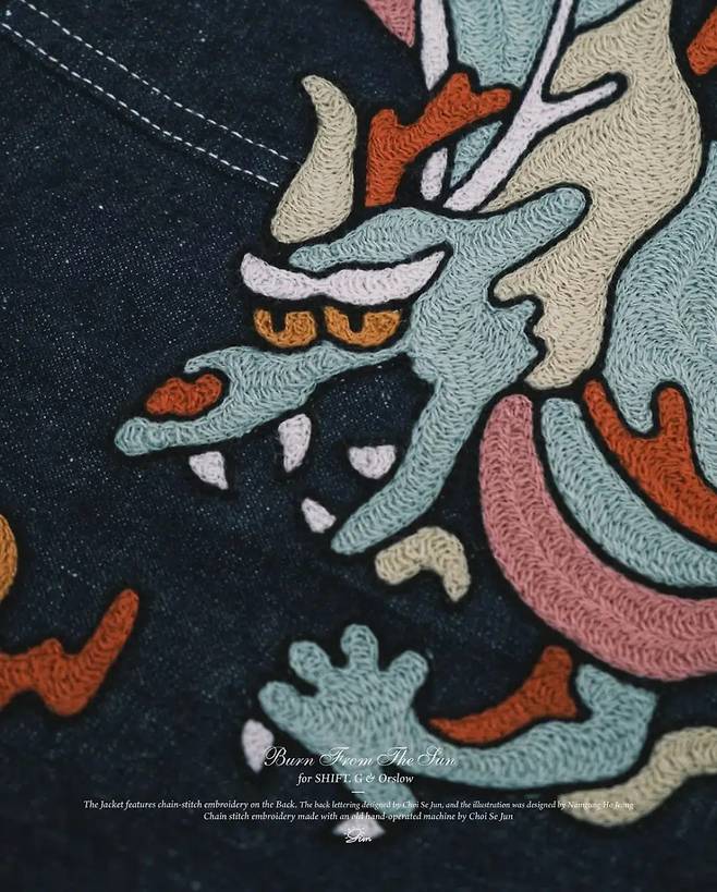 마침 회사에서 전개하는 브랜드에 워크 자켓이 있었고, 브랜드 슬로건을 새겨서 우리 팀만이라도 입고 다니기로 했습니다. 브랜드를 알리는 최전선에 있는 팀이거든요. 다행히도 다른 팀원들의 많은 관심을 받았고, 끈끈해진 분위기 덕에 높은 업무 성과까지 낼 수 있었죠. 이 자켓에 적용된 자수가 체인 스티치 입니다.