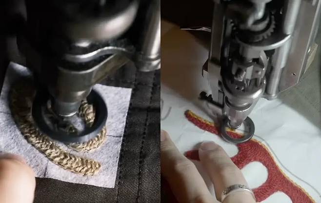 여기서 짚고 넘어갈 포인트가 있는데요. 체인 스티치는 청바지 수선 기법이 아니라는 것입니다. 청바지는 이 방식을 활용하는 사례 중 하나일 뿐이죠. 견고한 만듦새뿐만 아니라 실 한 땀이 지나가는 것보다 훨씬 더 짙은 색을 표현할 수도 있고, 입체감 있는 질감을 보여줄 수 있어 패션 아이템 뿐만 아니라 예술 작품을 제작할 때 적용하는 사례도 있습니다.
