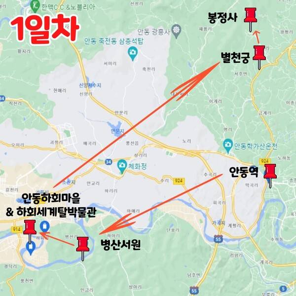 안동역 - 병산서원 - 안동하회마을 - 하회세계탈박물관 - 별천궁 - 봉정사