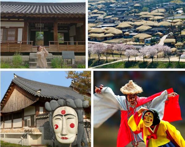 낙동강 상류 둘레로 드넓은 모래밭이 펼쳐지고, 그 위에 울창한 노송림이 들어서 있어 자연 경관이 미려하며, 하회마을 전체가 문화재라 할 정도로 전형적인 동성부락 마을의 가옥과 문화 유적들을 많이 볼 수 있습니다. 입장료는 성인 5,000원, 주차장은 입구에 전용주차장 2개 있습니다!