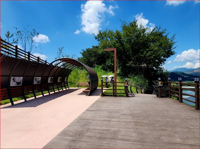 생태통로에서 왼편으로 향하면 만나는 길은 총 330m의 수변 데크길입니다. 본래 잔도란 절벽에 매단 길을 의미하지만, 이곳의 잔도길은 공포 대신 평온을 전해줍니다.