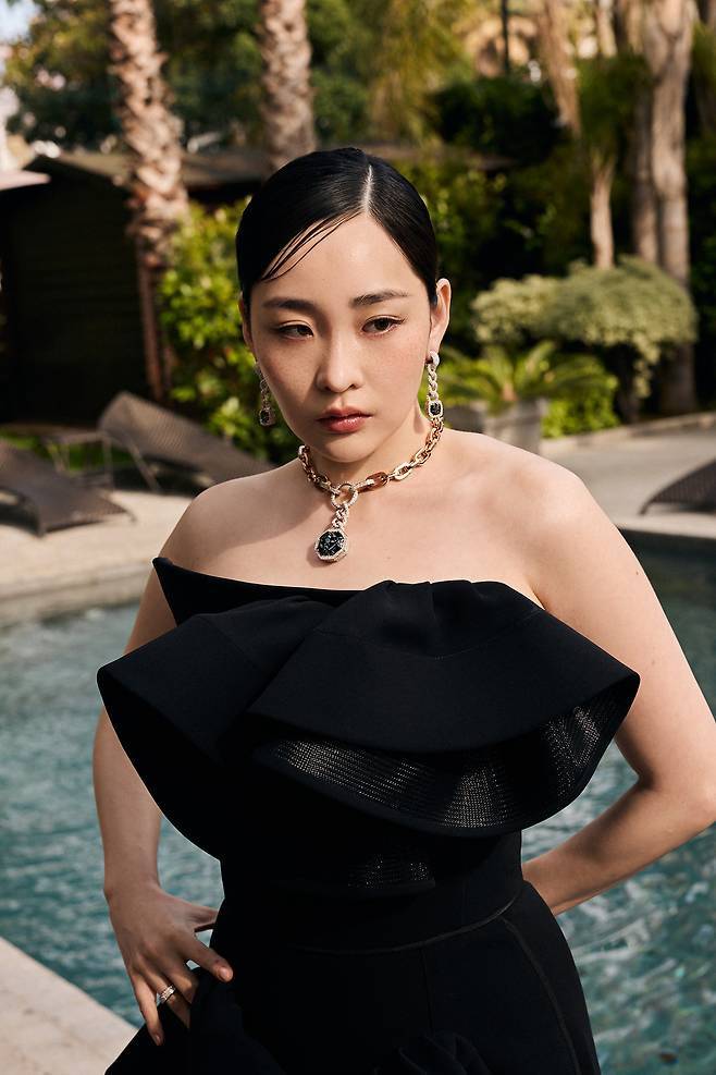 또 다른 룩에서 김민하는 블랙 드레스에 포멜라토의 주얼리를 매치한 고혹한 비주얼로 시선을 사로잡았습니다.