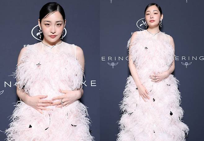김민하는 연분홍색 민소매 깃털 드레스를 착용해 로맨틱하면서도 우아한 자태를 뽐냈습니다.