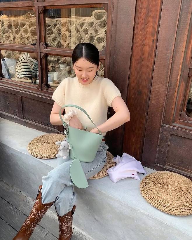 심플하지만 가볍지 않은 룩이었다. 아이보리빛 니트와 연청 데님, 그리고 어깨에 살포시 얹은 연핑크 카디건까지. 각각의 아이템은 수수한 색감이지만, 조합은 사랑스럽고 또렷했다. 봄 햇살이 옷 위에 스며든 듯한 무드였다.