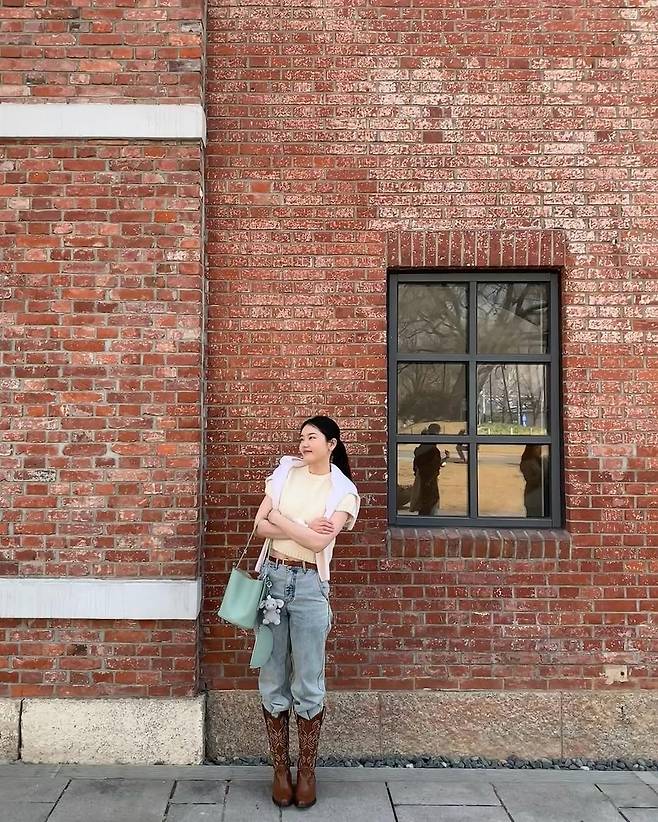 가장 눈길을 끈 건 부츠였다. 발목을 감싸는 짙은 브라운 컬러의 웨스턴 부츠는 귀여운 파스텔 코디에 살짝 다른 에너지를 더했다. 자칫 밋밋할 수 있는 데일리 룩에 리듬을 만들어주는 키 포인트였다.