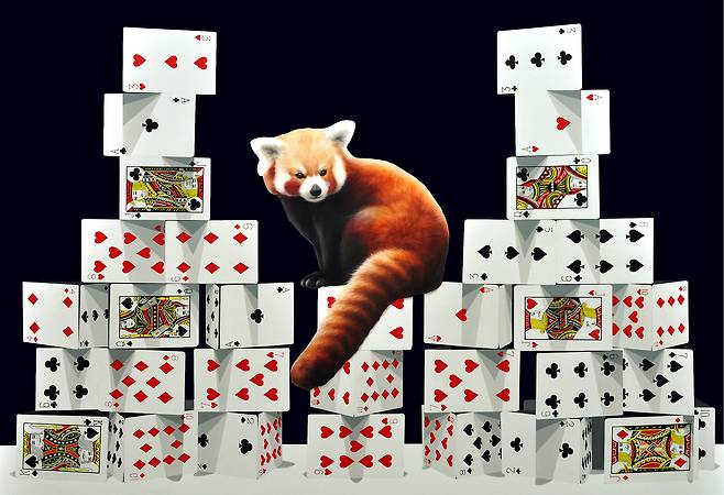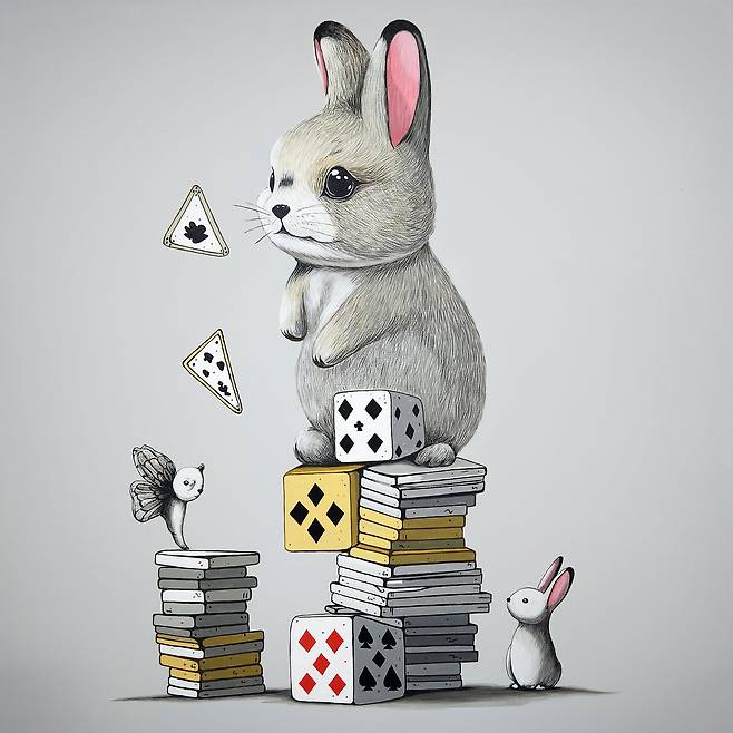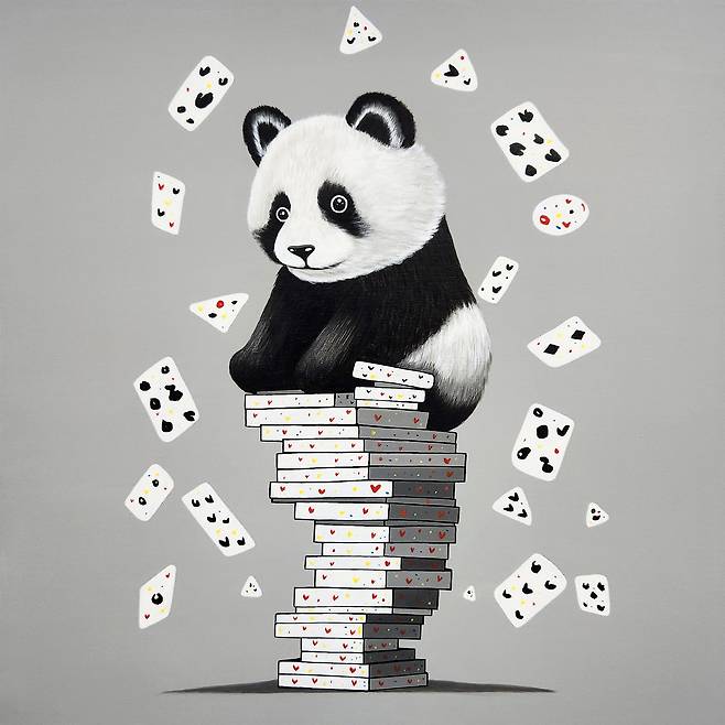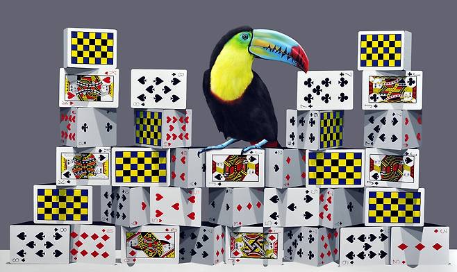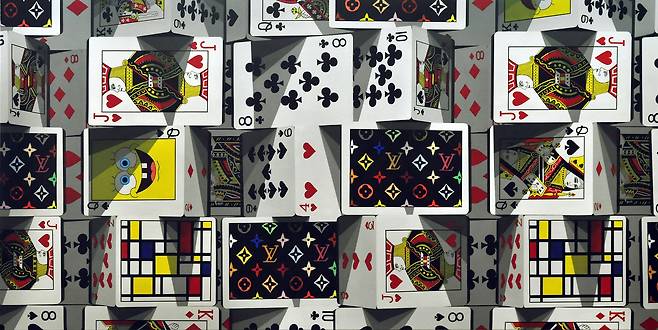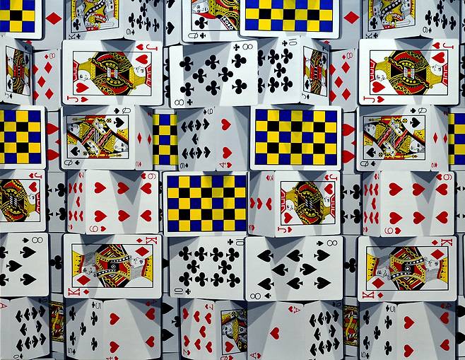 현대인들의 삶을 ‘카드(게임용 카드)’로 재현합니다. 스페이드, 다이아몬드, 하트, 클로버에 들어있는 의미와 수, 조형 방식에 따라 다양한 이야기들을 펼쳐냅니다. 작품에 '쌓아 올린 카드'는 두 가지 의미를 담고 있습니다.
