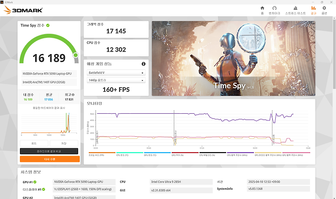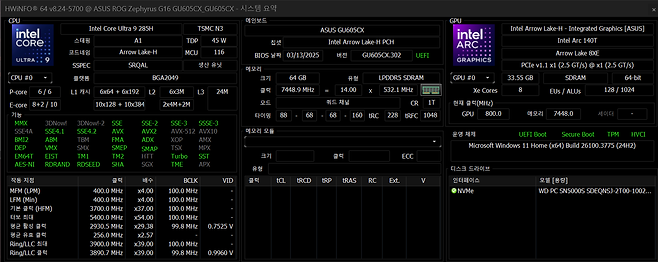 그럼 성능은 어떨까? 무서운 노트북이라 표현했으니, 당연히 성능도 무서울 정도다. 탑재된 CPU는 인텔 최신형 울트라 9 285H. 최대 5.4GHz, 16코어 16스레드 구성(P코어 6개, E코어 8개, 저전력 E코어 2개)으로, 노트북용 프로세서 중에서도 손꼽히는 성능을 자랑한다. 연산이 필요한 작업이라면 스레드를 아낌없이 갈아넣어 처리한다.
