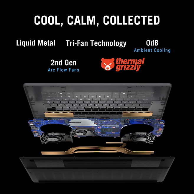 제피러스 G16 GU605CX는 ‘조용하면서도 성능 좋은, 가벼운 게이밍 노트북’이라는 쉽지 않은 포지션에 도전했고, 결국 완성해냈다. 내부에는 베이퍼 챔버, 트라이팬 구조, 2세대 아크 플로우 팬, 리퀴드 메탈 서멀, 고효율 배기구까지… 성능과 정숙함을 모두 잡기 위한 기술이 총동원됐다. 가벼운 작업 시엔 팬이 완전히 멈추는 0dB 앰비언트 쿨링으로 조용하게, 고성능이 필요한 순간엔 즉시 팬이 작동해 발열을 효과적으로 잡는다.