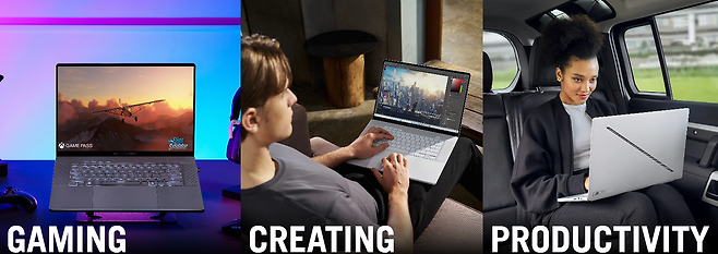 제피러스 G16 GU605CX의 소개 이미지에는 보란 듯이 Gaming, Creating, Productivity라 적혀 있다. 게임(그냥 게임), 창작(영상 편집 등), 생산성(오피스 작업) 등에 최적화됐다는 이야기다. 그리고 소개 이미지를 잘 보면 무릎에 올려놓고 쓴다거나, 혹은 달리는 차 안에서 작업을 하고 있다. 즉 이미지까지 포함해서 말한다면 ‘아무데서나’ 그리고 ‘아무거나’ 다 잘 된다는 이야기다.