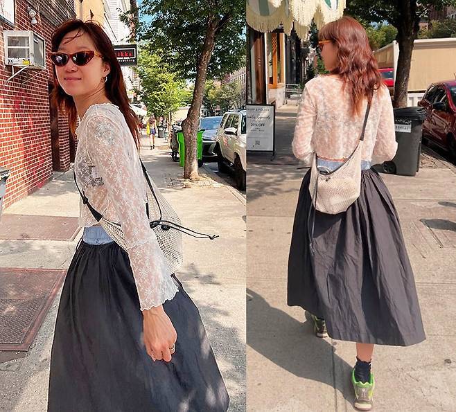 시스루 레이스 블라우스에 블랙 플레어스커트를 매치해 특유의 내추럴하면서도 유니크한 무드로 뉴요커 감성을 완성했습니다.
