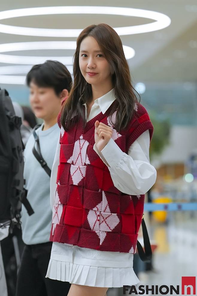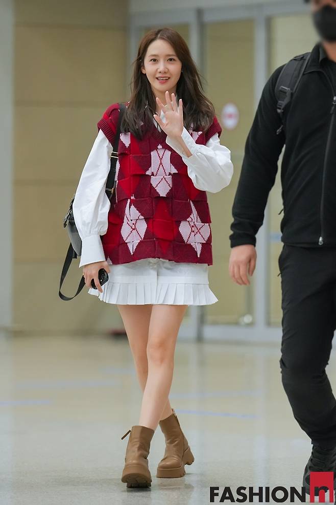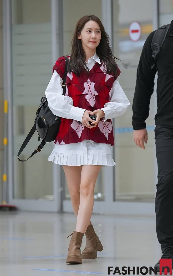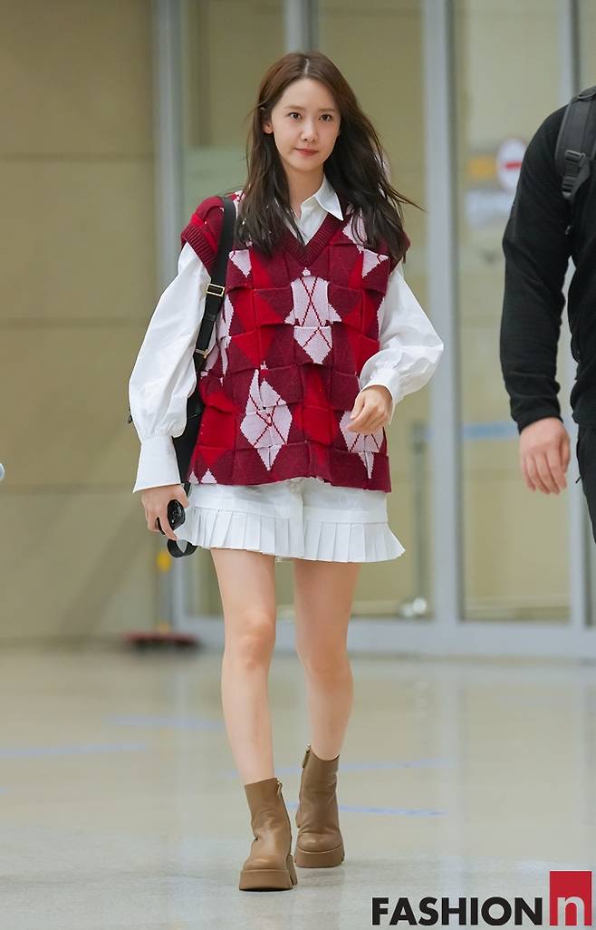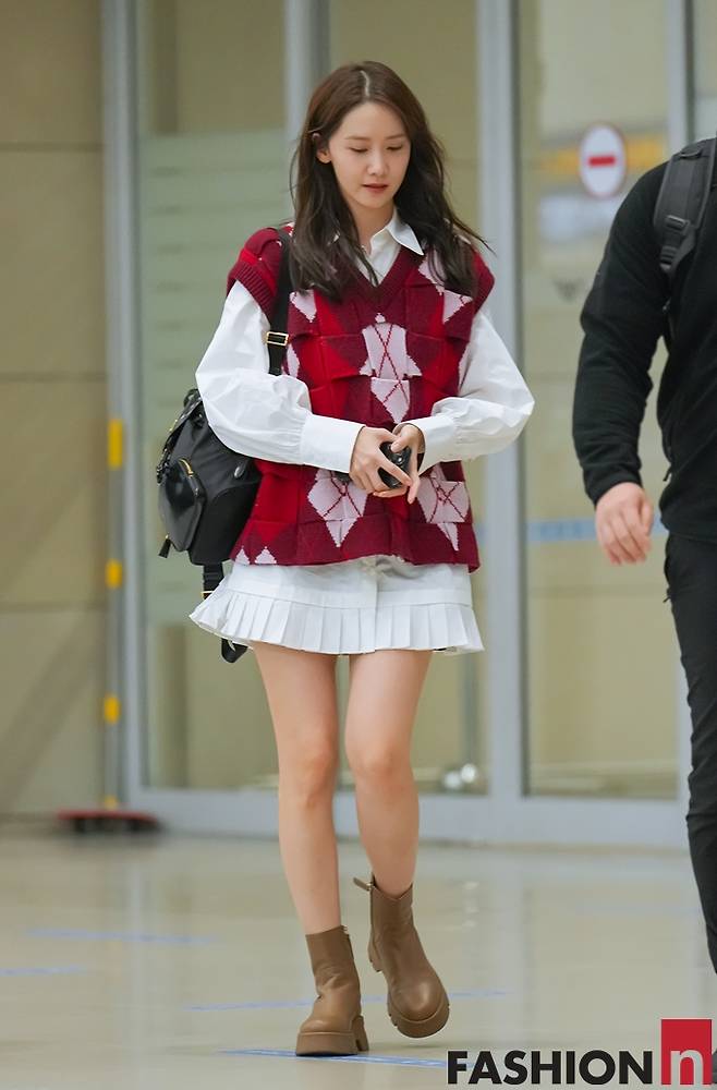 소녀시대 윤아가 태국 팬미팅을 끝내고 귀국하면서 미니 셔츠 원피스와 트위드 베스트 공항룩으로 꽃미모를 발산했다.