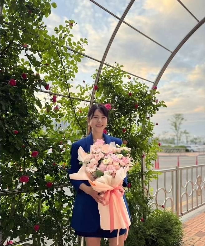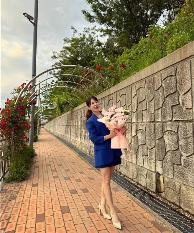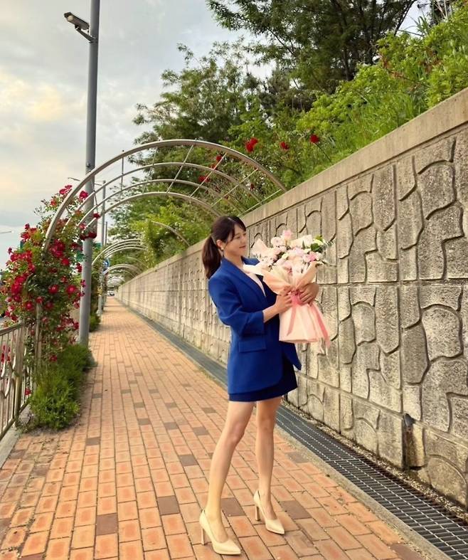 양지은은 블루 재킷과 미니스커트를 셋업으로 착용해 시원하고 활기찬 분위기를 자아냈습니다.