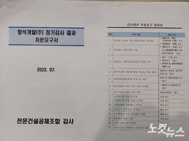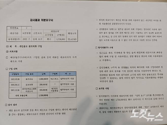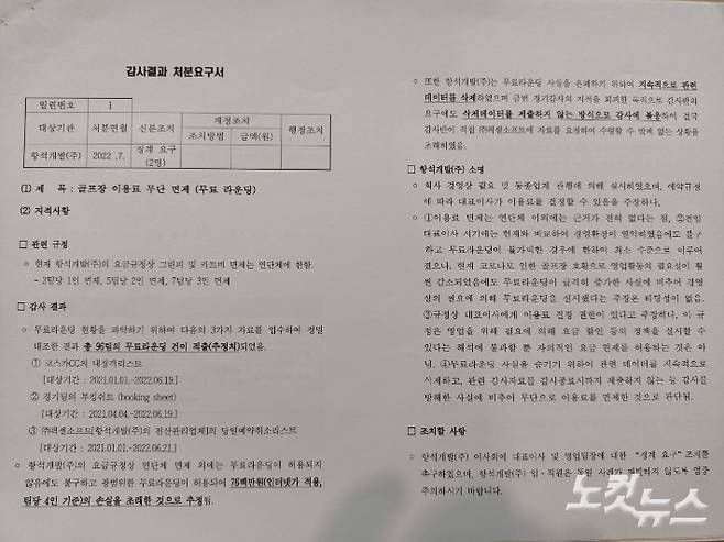 4일 CBS노컷뉴스가 입수한 '항석개발(주) 정기감사 결과 처분요구서'에는 당시 코스카CC 골프장 대표 이 모 씨에 대한 해임을 요구하는 내용이 담겼다. 해당 문건은 지난해 7월에 작성됐다.