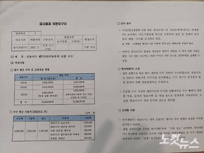 이번 감사에서는 신용카드 밴(VAN)사로부터 골프공과 현금 등을 리베이트로 수수한 사실도 적발됐다. 2020년~2022년 6월까지 골프공은 1841만 원어치, 현금은 1158만 원을 받았다.