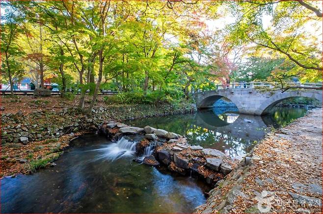 선운천 산책로 : 계곡 물빛에 비친 붉은 꽃무릇의 반영