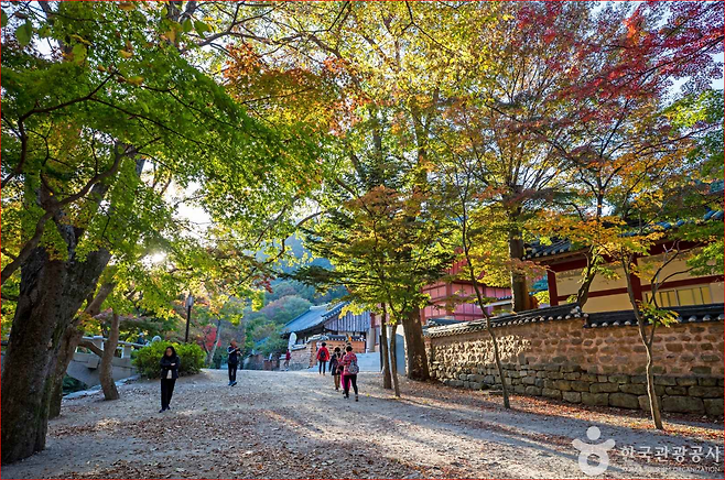가을 : 붉게 타오르는 꽃무릇이 일주문에서 대웅전까지, 그리고 천왕문 주변과 계곡 산책로까지 이어져 장대한 꽃길을 만듭니다.