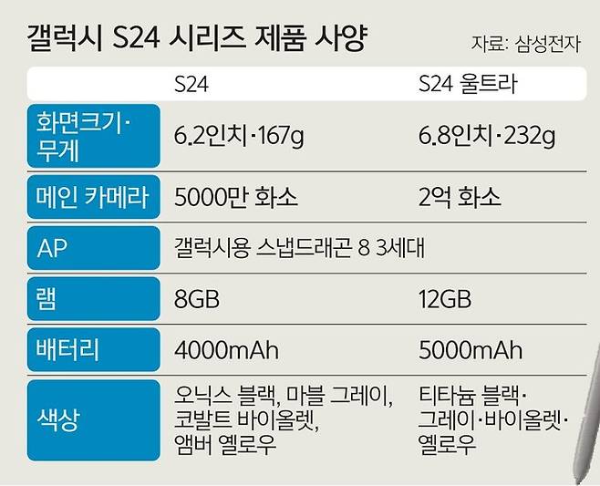 갤럭시 S24 울트라는 12GB 메모리에 256GB, 512GB, 1TB 스토리지를 탑재한 모델이 기본으로 출시된다. 가격은 각각 169만8400원, 184만1400원, 212만7400원이다. 갤럭시 S24+는 12GB 메모리에 256GB 스토리지를 탑재한 모델이 135만3000원, 512GB는 149만6000원이다. 갤럭시 S24는 8GB 메모리에 256GB 스토리지 모델이 115만5000원, 512GB는 129만8000원이다.