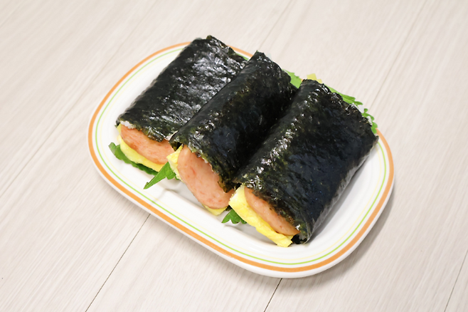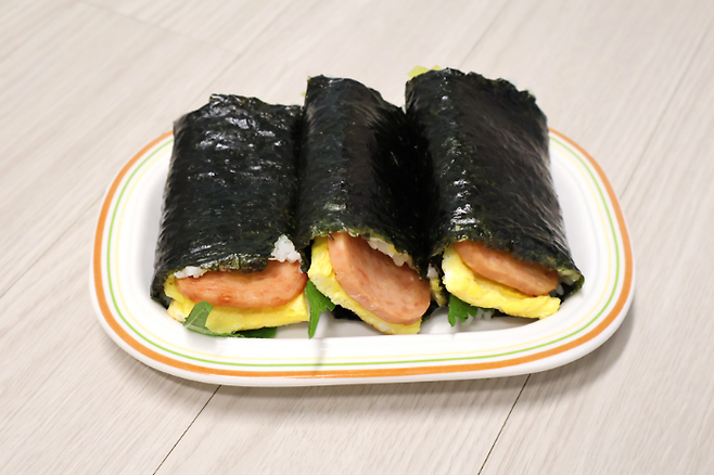 단무지, 김, 밥, 스팸, 계란, 깻잎