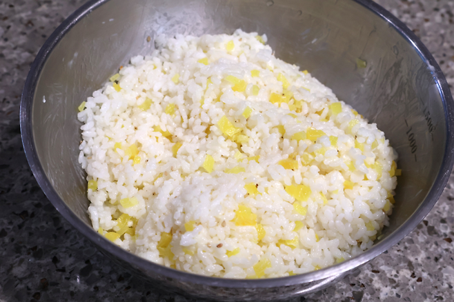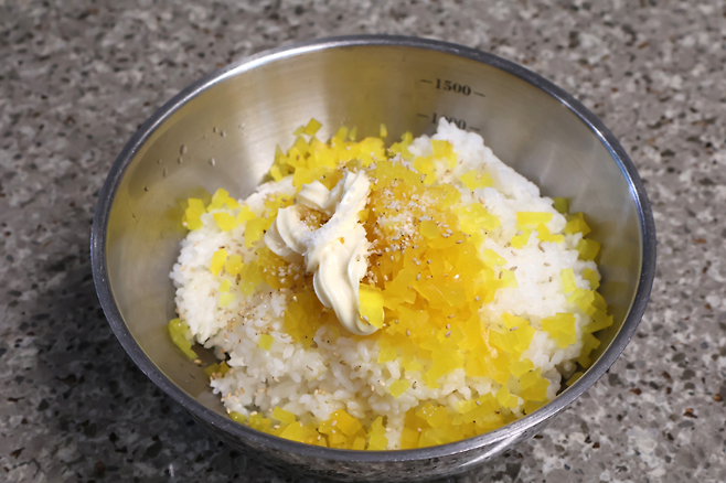 그다음 고슬한 밥 위에 다진 단무지, 마요네즈 약간, 소금 두꼬집 넣어 버무리면 돼요. 마요네즈와 단무지의 양은 밥 양에 따라 조절하면 됩니다. 김밥에 들어가는 밥에 마요네즈를 넣으면 고소하면서도 윤기가 돌아요. 마요네즈의 맛을 싫어한다면 빼도 괜찮습니다.