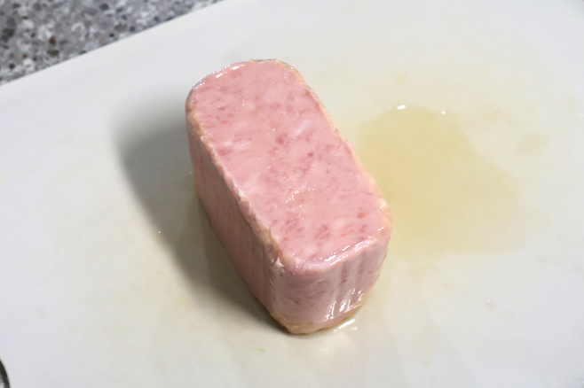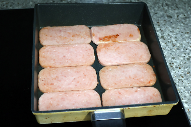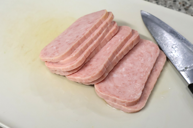 스팸도 한 통 꺼내고요. 8개 정도로 나눠 썰어줍니다.