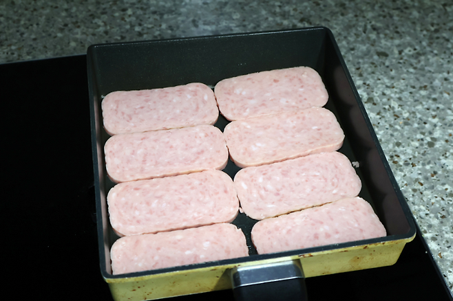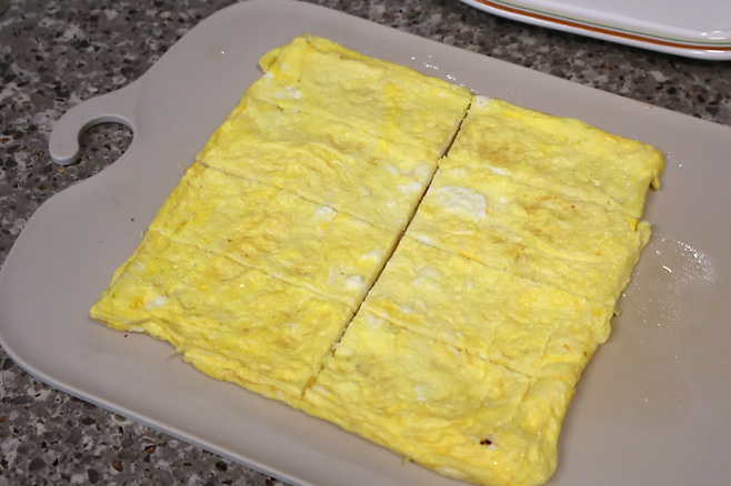 노릇하게 부친 계란지단은 햄과 비슷한 크기로 썰어줍니다. 저는 스팸이 8개 들어가는 팬이라 계란도 똑같이 8조각으로 잘랐더니 딱 맞았어요.
