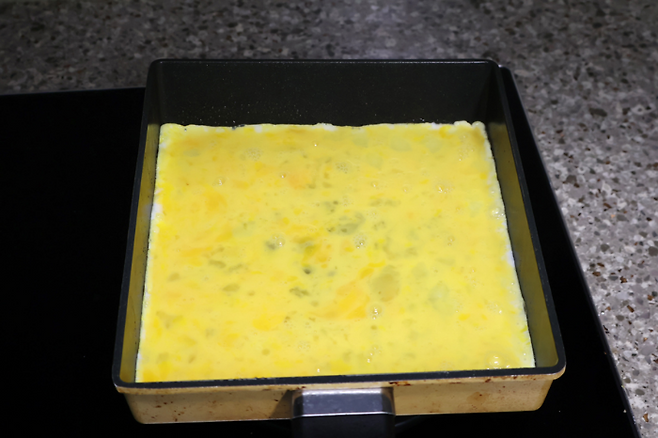 계란을 곱게 푼 다음 스팸 덜어낸 계란팬에 넓게 부쳐요. 그래야 사이즈 비슷하게 자르기 편해요.