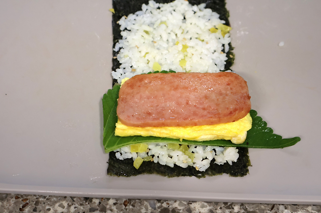 위에 깻잎과 계란, 스팸을 하나씩 차곡차곡 올리고 그대로 접어주면 돼요.