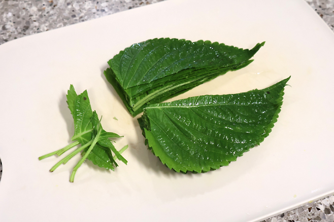 깻잎 몇장 있길래 꺼냈어요. 꼭지를 자르고 반으로 썰고요.