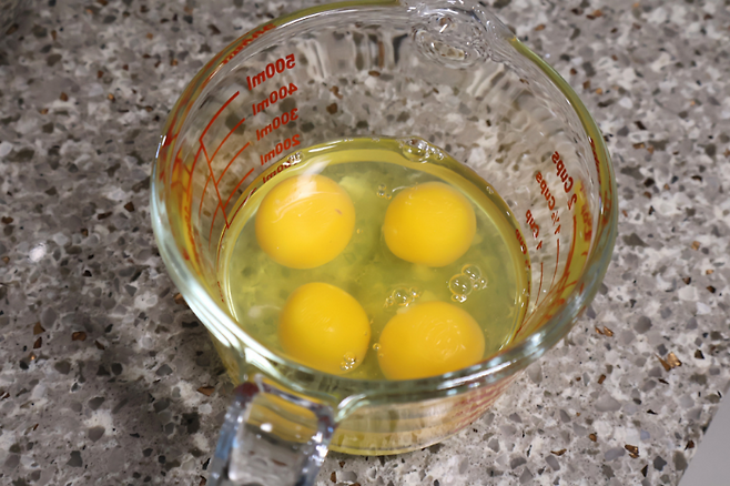 계란은 4알을 깨트렸어요. 사람 수대로 깨트린건데 계란이 좀 두툼해야 맛있더라고요. 계란에도 소금을 넣을까 하다가 스팸도 짜고 단무지도 짜서 계란은 별다른 간 없이 부쳤답니다.