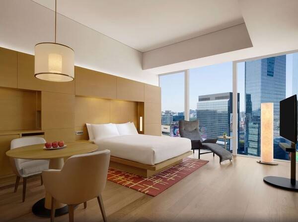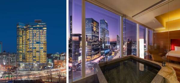 서울에서 가장 비싼 6성급 호텔인 파크 하얏트는 도시적이고 현대적인 느낌이 많이 드는 호텔입니다. 그런 느낌이 드는 이유는 바로 방에 들어서면 정면에 고층 빌딩인 무역 센터가 보이기 때문이죠. 바닥부터 천장까지 통 유리창으로 되어 있어 역동적인 서울 강남의 도시 전망을 감상할 수 있습니다.